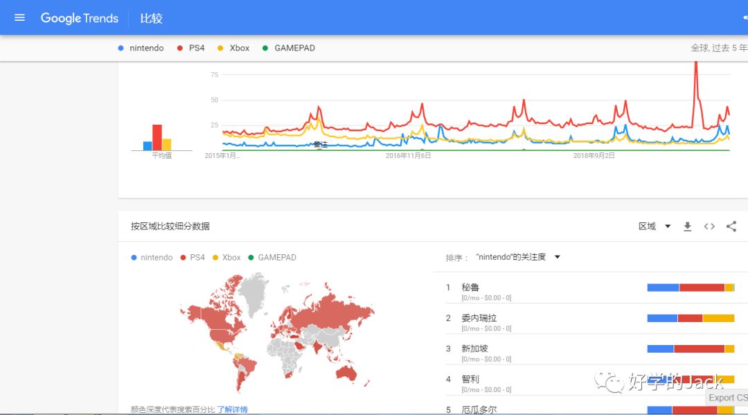 譬如说Jack想做游戏机手柄的配件,那么目前市面上最火的笔记大家也知道,任天堂,索尼的PS4,微软的XBOX,我们在谷歌趋势把这个几个关键词放进去,对比查看各自的搜索量曲线,你会发现索尼的PS4搜索量最大,任天堂比XBOX高一点,我们大概可以预估PS4这个产品市场量也大一些,因为搜索量和销售量基本成正比的。(这里面建议大家选择搜索范围为全世界,时间长度为过去五年,这样子数据量大,更有参考依据)附上这个谷歌趋势链接,大家翻墙的可以直接打开。