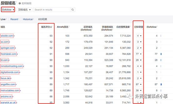 选择DOFOLLOW然后按照评分从高到低排序,点击目标链接多的域名。一般目标链接比较多的域名,基本都是博客,论坛,PDF和图片提交网站