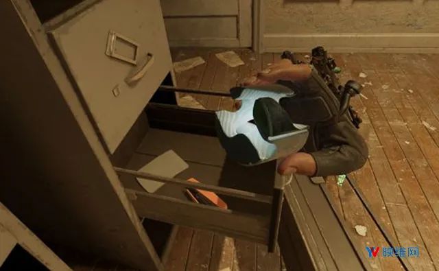 双手不会穿透环境,而且周围散布着一系列的可交互对象,所以游戏世界有一种坚实的感觉,并有助于推动沉浸感。有一次当我文件柜里翻找资源时拉开了最底部的抽屉,而我站起来后顺势想用脚把它关上,就如同现实世界一样。当然,我很快意识到游戏并没有追踪我的双脚。