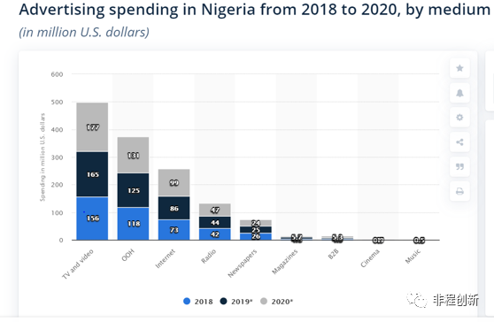不同于欧美市场,目前尼日利亚市场占据统治地位的依然是电视广告。随着互联网渗透率的提高,在线广告份额呈整体上升趋势,2020年预计达到9900万美元规模。