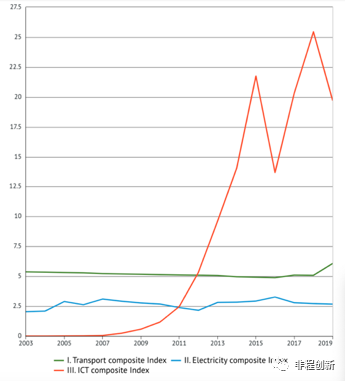 (ICT与交通和电力基础设施发展对比;数据来源:Africa Infrastructure Development Index)