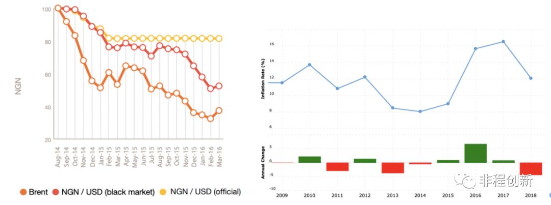 2014到2016年的石油价格危机对尼日利亚经济冲击深远,首当其冲的就是汇率。尼日利亚政府为了控制汇率,采取了货币管制,尽管2016年之后保持住了对美元的汇率,但也因此消耗了大量外汇储备。此外,通过汇率,石油价格危机的影响也传导到国内价格变动,导致通货膨胀一度飙升至15%以上。不过通过政府近两年财政政策和货币政策双管齐下,目前通货膨胀率已稳定在2009年水平左右,不过还是高于政府目标区间(6%-9%)。