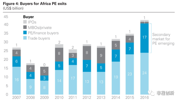 不仅如此,一级私募股权市场信心也上升,根据 AVCA 的统计,2012年至2017年,尼日利亚私募股权交易总额达78亿美金,是同时期南非市场的3倍、肯尼亚市场的7倍之多。同时,私募二级市场股权交易也在逐渐萌芽。