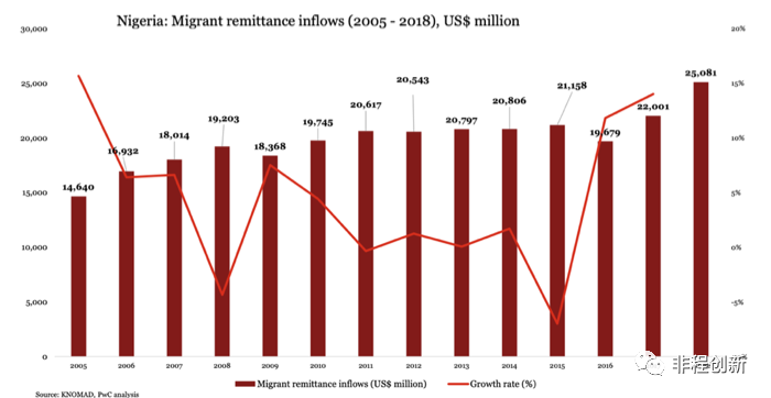 (2005-2018年尼日利亚所收到的境外汇款;数据来源:PwC)