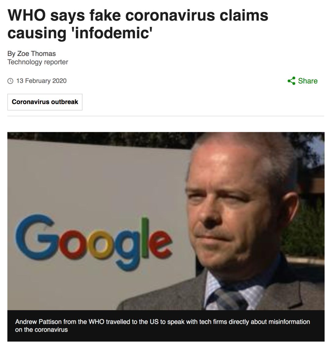 2020年2月2日,世界卫生组织称,新的冠状病毒的爆发与反应,伴随着一场大规模的"信息流行病"(infodemic),该词系information(信息)与epidemic(流行病)组合而成,特指"信息过多——有些准确而有些不准确——这使得人们在需要时难以找到可信赖的来源和可靠的指南"【1】。