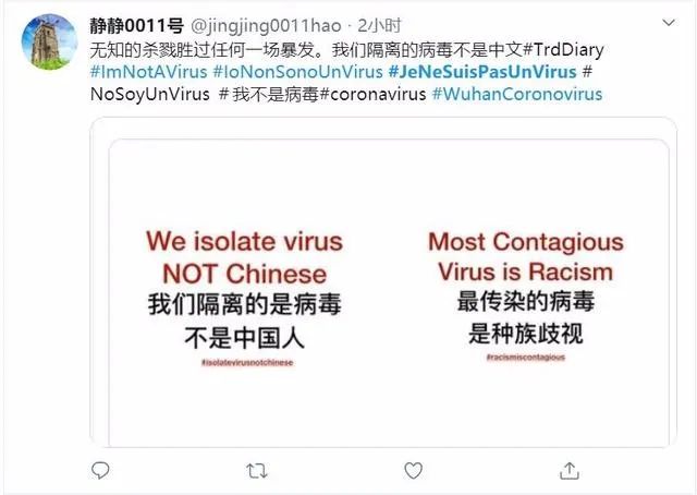 在澳大利亚、欧洲和美国,都出现了令人难过的事情:东亚面孔长相的人们被口头咒骂,吐口水,赶下公交工具,逐出咖啡馆,阻止进入商店,甚至遭到暴力袭击。亚裔被迫打出"我不是病毒"的抗议口号。在法国,亚裔社区在推特上创造了#JeNeSuisPasUnVirus主题标签,以回应该地一系列出于种族动机的攻击。