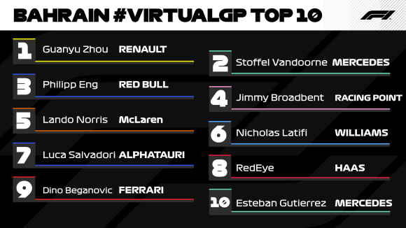 尽管比赛变成了线上,但F1赛车媒体的报道与线下别无二致。在第一场巴林虚拟大赛中,雷诺车队的试车手周冠宇取得冠军,梅赛德斯的替补车手斯托弗·范多恩获亚军,红牛车队的菲利普·恩格则收获第三。