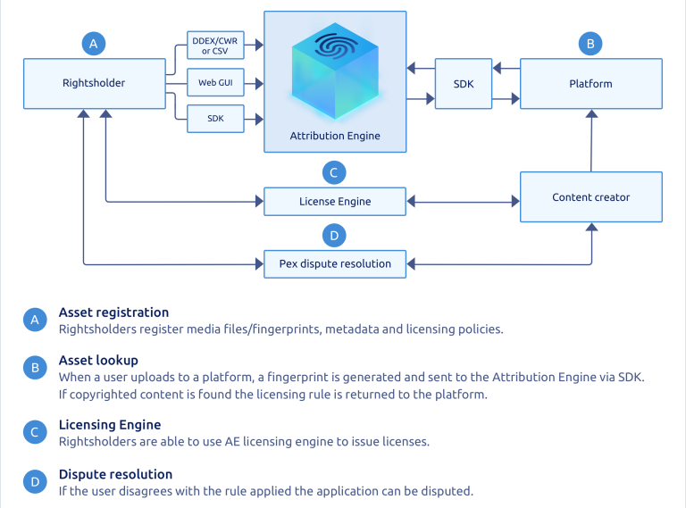 面对行业趋势,初创公司Pex打算提供版税归属解决方案。从2014年开始,Pex扫描社交网络和内容平台上的信息,寻找可能有版权纠纷的内容。然后,Pex会让内容方与网络平台协商使用许可,对侵权内容请求撤下,或者跟踪统计消费数据,帮助原创者获得报酬。