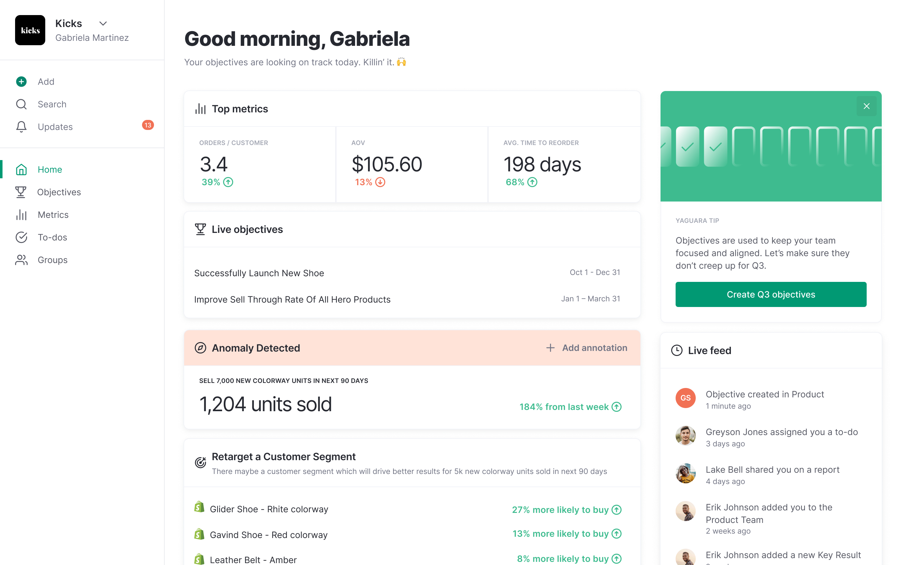 "Yaguara 的基础是整合数据,并将这些数据放在正确的位置",Smalley 介绍到。电商公司的数据可能来源于几十个工具,包括效果营销、电商销售、获客成本等,Yaguara 将所有这些都整合到一起,让公司能够实时全面地了解自己的数据。在获取这些数据后,Yaguara 还会向公司提供预测性的洞察和建议,帮助公司在统一数据集的基础上推动业务进展。