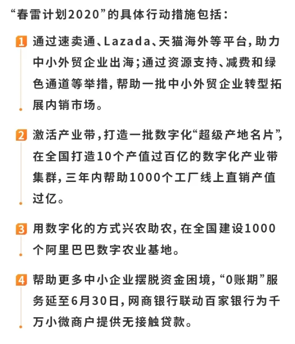 36氪获悉,阿里巴巴董事会主席张勇宣布,时隔11年再次启动扶助中小企业的特别行动——"春雷计划",用一切必要行动帮助中小企业,共渡难关。"春雷计划2020"的具体行动措施包括:通过速卖通、Lazada、天猫海外等平台,助力中小外贸企业出海;在全国打造10个产值过百亿的数字化产业带集群;在全国建设1000个阿里巴巴数字农业基地等。