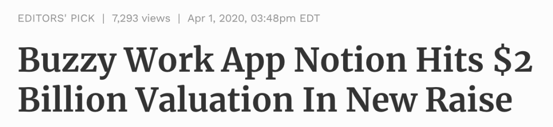 根据 Forbes 今年 4 月 1 日的报道,Notion 在最新一轮融资中获得 5000 万美元的融资,达到 20 亿美元的估值。
