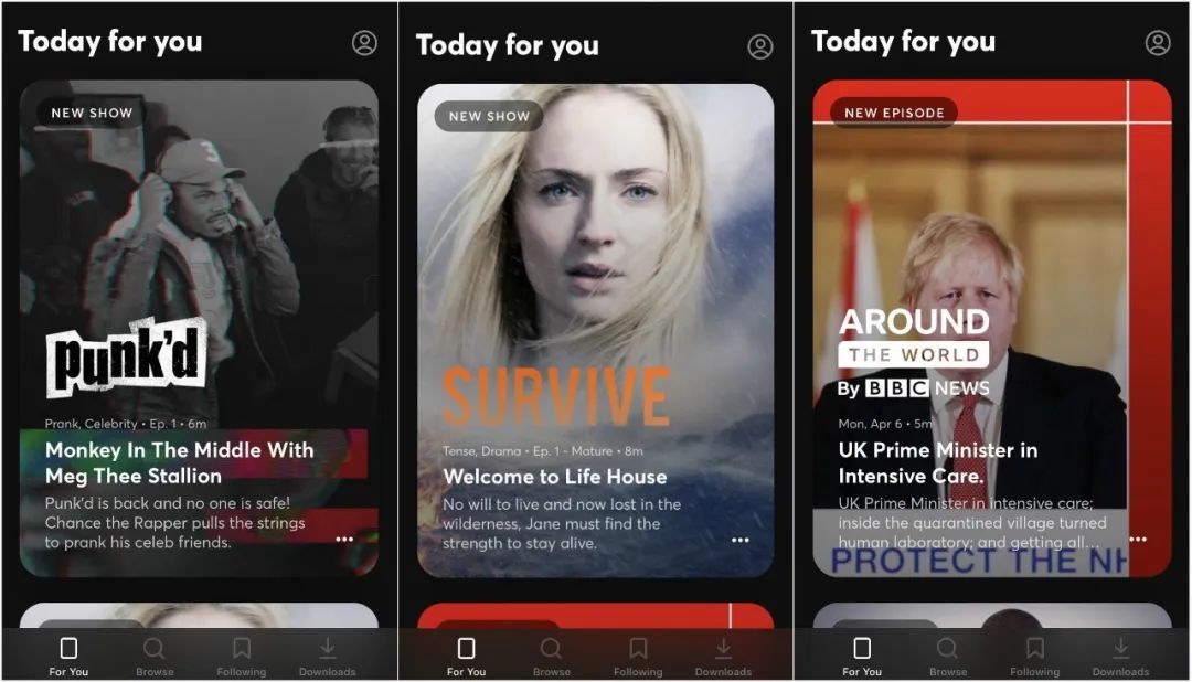 这种平台完全掌控的原创定制内容路线,让它立刻从一众短视频平台里脱颖而出。然而它自己定位的目标观众又和 TikTok 们并无本质上的不同——渴望打发碎片时间的用户。这形成了一个有趣的竞争局面,它似乎愿意在品质上与流媒体竞争,但在消费场景上避开了后者,进入了主打快餐娱乐的领域。